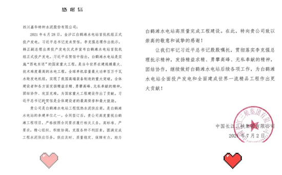 7月5日,中国建材集团所属中国建筑材料科学研究总院有限公司(以下简称“中国建材总院”)和嘉华特种水泥股份有限公司(以下简称“嘉华水泥”),分别收到了来自白鹤滩水电站开发建设方中国长江三峡集团有限公司的感谢信。