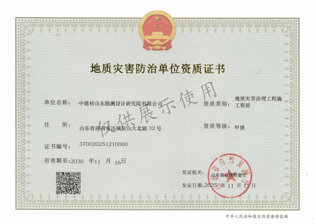近日,中建材山东勘测设计研究院有限公司成功取得山东省自然资源厅颁发的地质灾害治理工程施工甲级资质(证书编号370020251210060)。此次资质的晋升,标志着中建材山东勘测设计研究院有限公司在地质灾害防治领域的综合竞争力实现了跨越式提升,技术实力、施工能力和管理水平得到了行业普遍认可,为中建材山东勘测设计研究院有限公司拓展全国市场、参与更高标准的地质灾害防治项目奠定了基础。