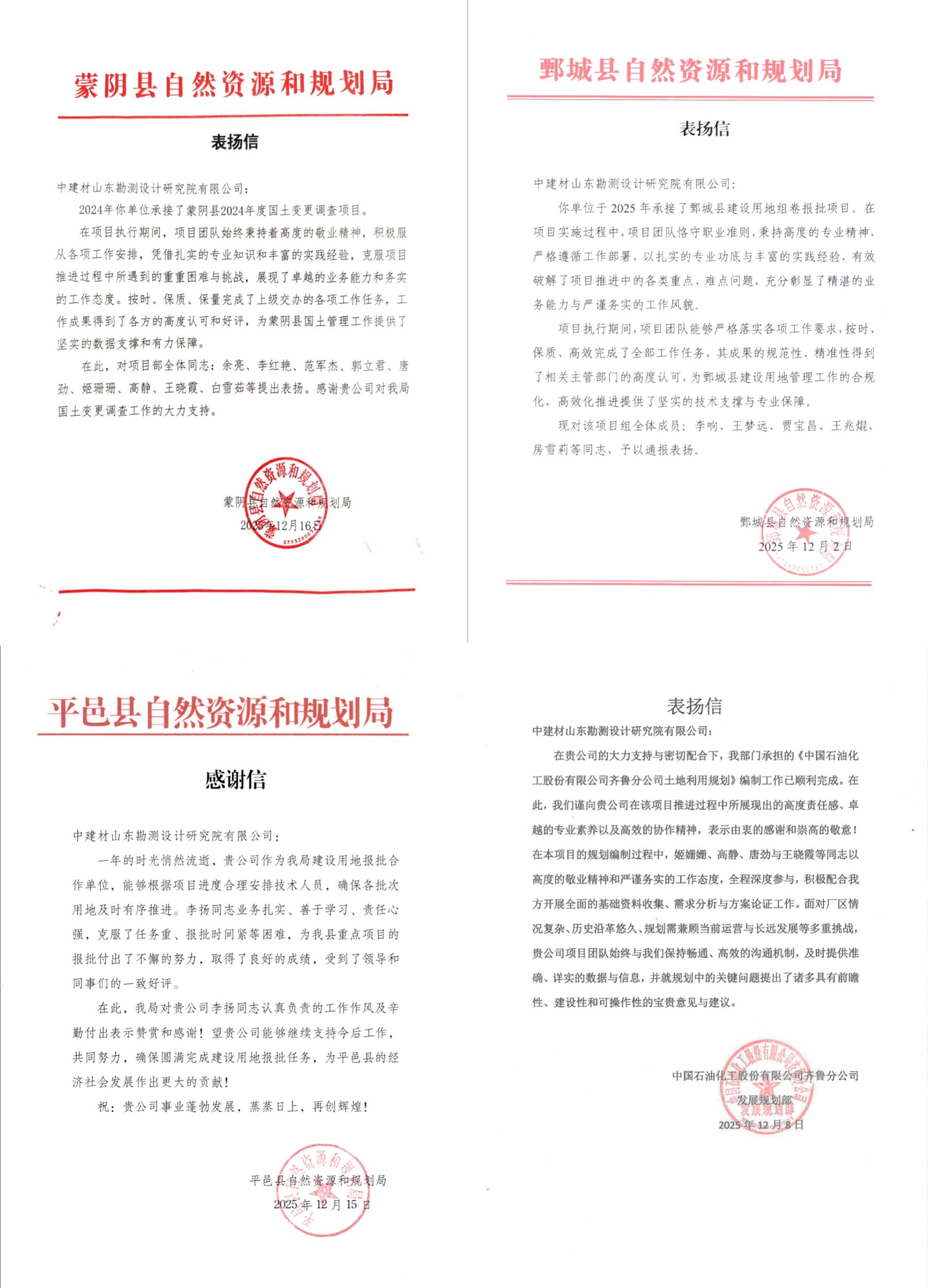 近期,地理信息中心接连收到来自中国石油化工股份有限公司齐鲁分公司、鄄城县自然资源和规划局、平邑县自然资源和规划局、蒙阴县自然资源和规划局等合作单位的表扬信、感谢信。信中对项目团队精湛的专业技术、严谨负责的工作作风以及协同高效的团队精神给予高度赞赏,充分肯定了项目成果对甲方工作的顺利开展提供了强有力支撑。